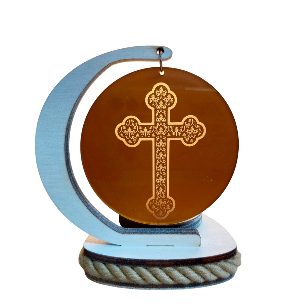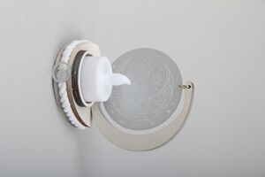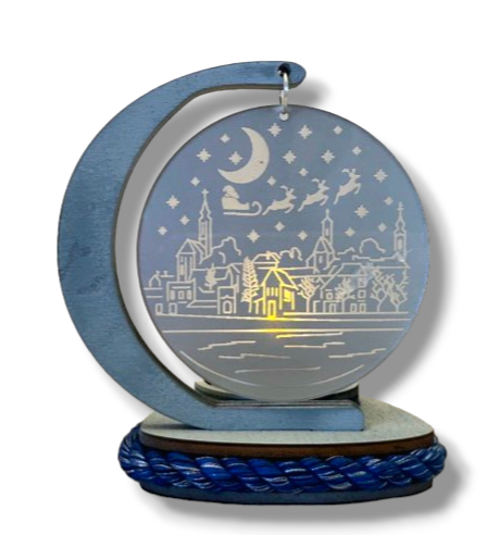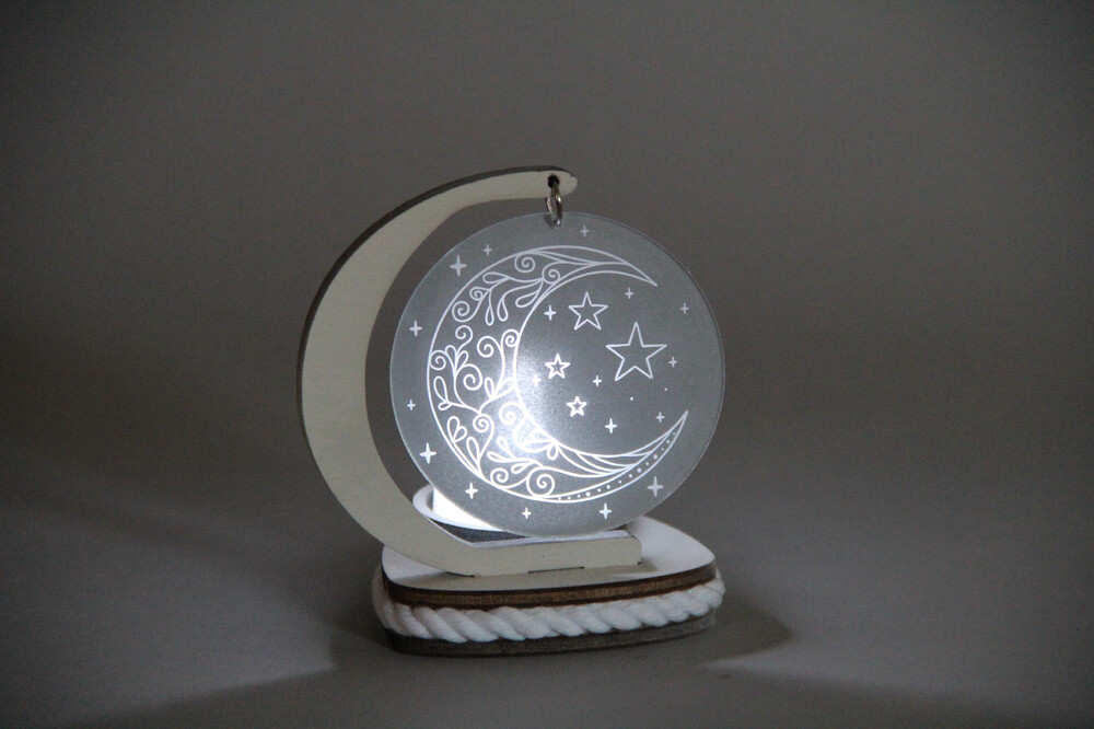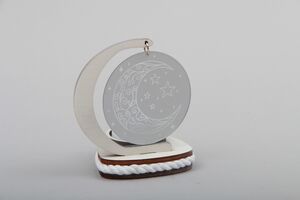A rétegelt nyárfából készült, holdat idéző mécses formavilágát egy egyedileg mintázott ezüst vagy arany speciális kétrétegű transakril korong teszi különlegessé. A mécses formavilágának tervezésében közreműködtek