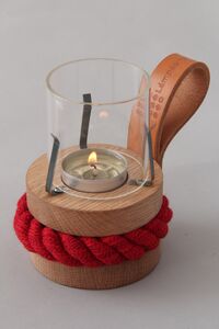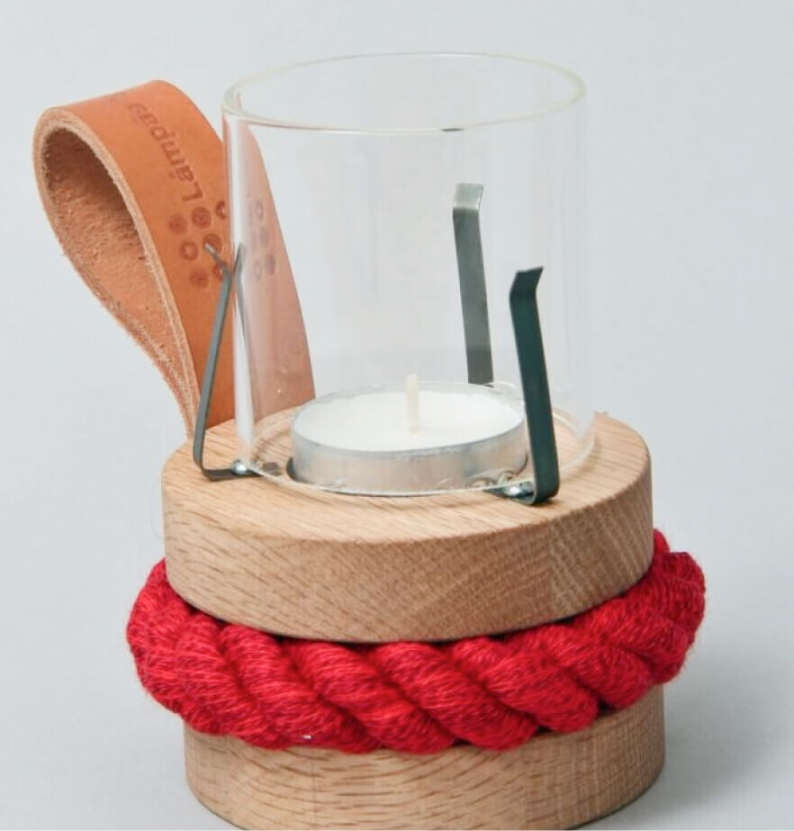 Egyedi készítésű lámpás, kézi szövésű vertkötéllel díszítve, tölgyfából, bor fogantyúval és különleges üveghengerrel. Az anyagok kiválasztásakor a legfontosabb szempont a környezettudatosság volt. A magas minőségű kézi szövésű pamutkötél ötféle színkombinációban érhető el. Az FSC minősített faanyagok felületkezelése narancsolajjal történik, mely környezetbarát és tartósítószer mentes. Tervező: Laborcz Tamás, FromWood.